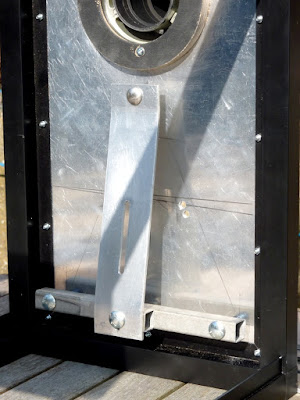 I later added a short length of Porsa tubing bolted to the lower tube of the 'shoulder.' By using a power tool burr on the backing disk, to make room for the domed coach screw head, and two rubber tap washers the 2nd mirror cell lay flat on the tilt strip. I now had finely adjustable and very stable location of the 2nd mirror. Just as with the 1st mirror there was no shake or slack at all.