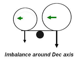 The instruments on a mounting must always be balanced around both axes. Or there will a highly variable rotational force around one or both axes. I applied weights on stalks with earlier arrangements to balance the Declination rotational forces. Though this addition must be compensated for by moving the main counterbalance weights outwards. Just adding an offset finder or guide telescope can seriously throw the balance off.