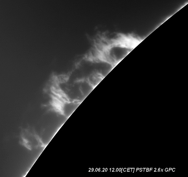 Tuesday 23rd 10.25 67/64F, bright sunshine but with highly variable cloud. Not much to see on the disk nor limb in H-a. Just the usual, random surface features. Small proms remain at 11 o'clock. NE.